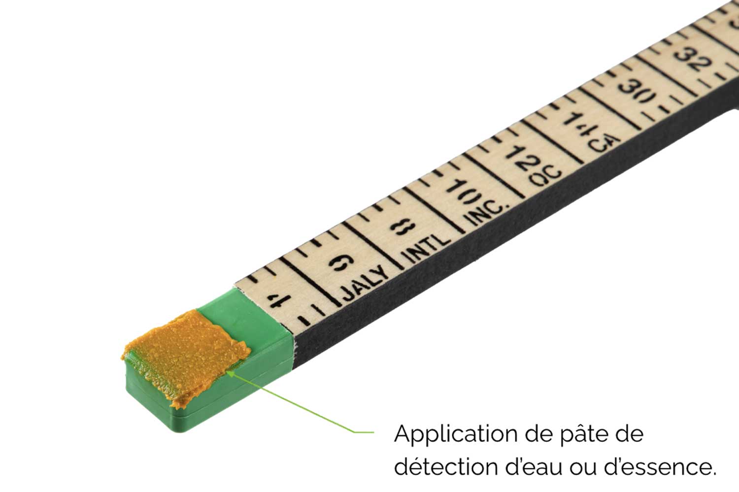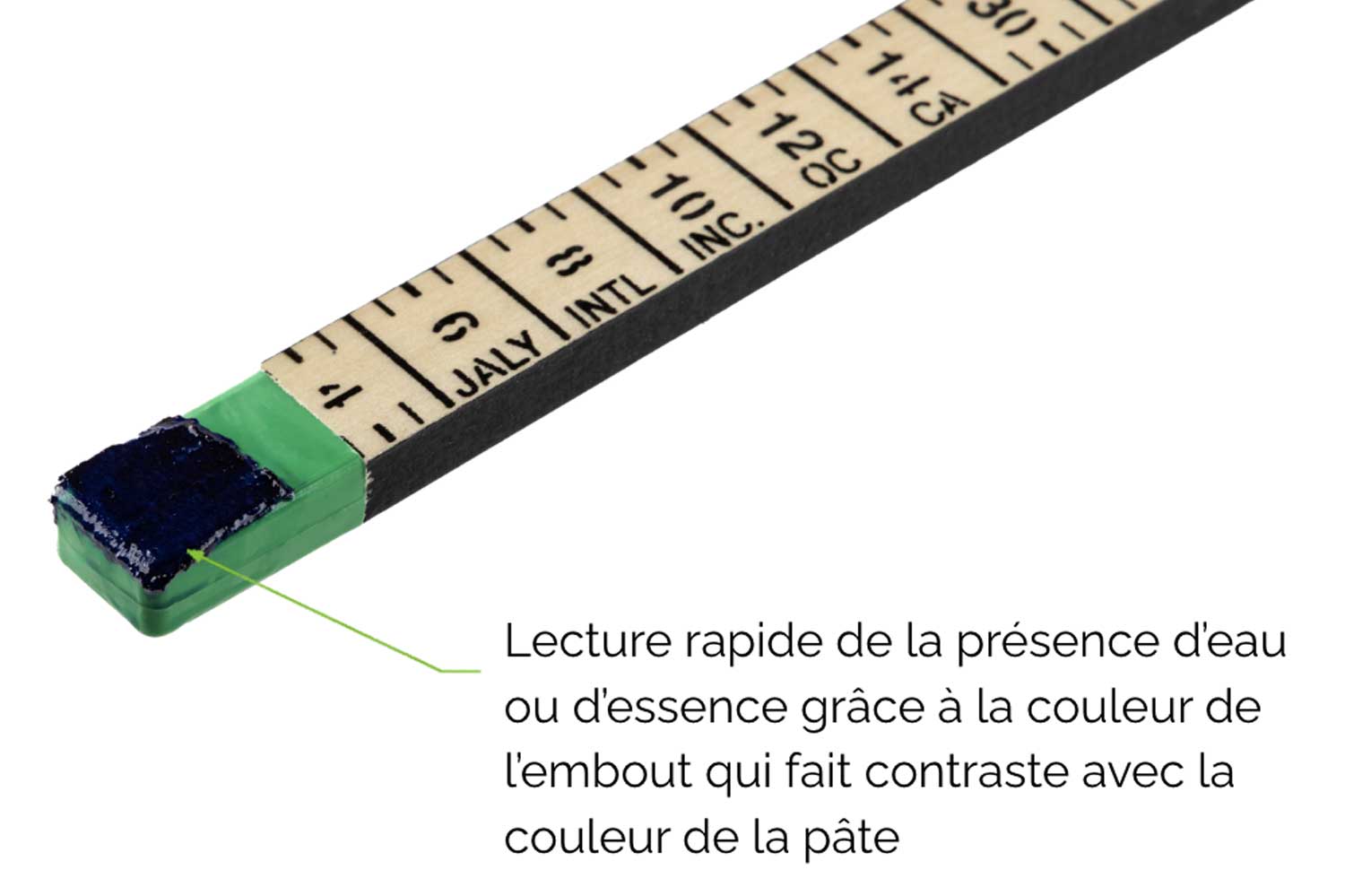 L’embout vert des régles Jaly est idéal lors de tests d’eau. Il permet de voir rapidement la couleur qui détermine la présence d’eau dans le réservoir.